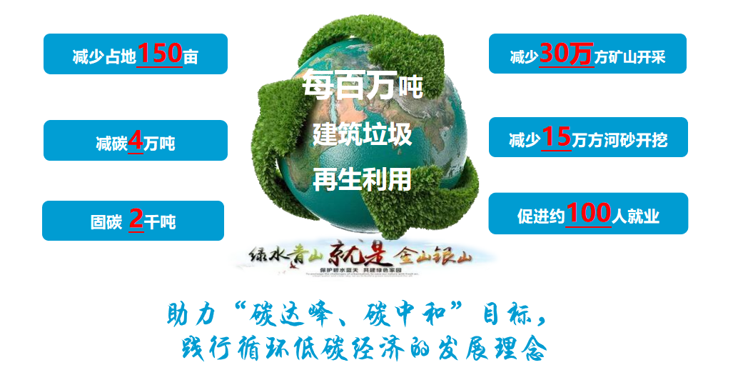Through practical testing: construction waste has carbon sequestration capacity, especially waste concrete carbon sequestration capacity is stronger, in the current high carbon emissions, carbon reduction, no carbon, carbon removal and other technologies are insufficient, construction waste resource utilization at the same time carbon reduction, carbon sequestration, will provide new impetus for China to achieve the "dual carbon" goal. The implementation of the technology of this project can reduce the area occupied by 150 mu, reduce mine mining by 300,000 square meters, reduce river sand excavation by 150,000 square meters per million tons of construction waste, and at the same time reduce carbon emissions by 40,000 tons and sequester 4,000 tons, practicing the development concept of circular low-carbon economy "green water and green mountains are gold and silver mountains".